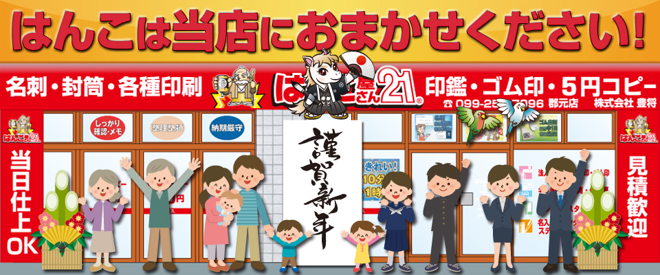 鹿児島市内にある印鑑やゴム印・名刺の専門店「はんこ屋さん21郡元店」のホームページです。アクセスありがとうございます。